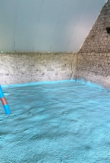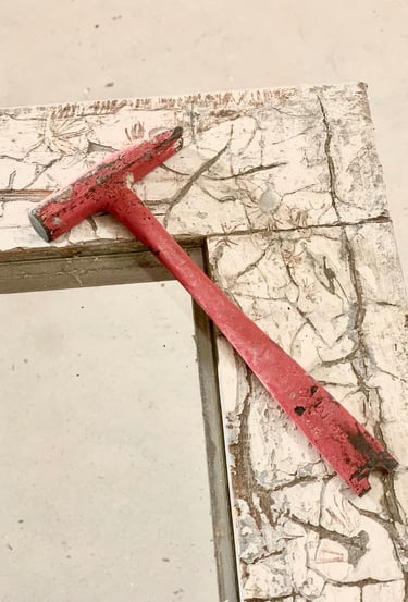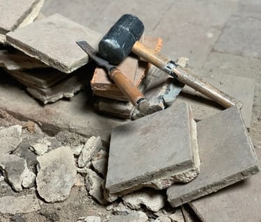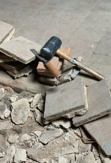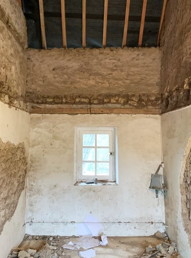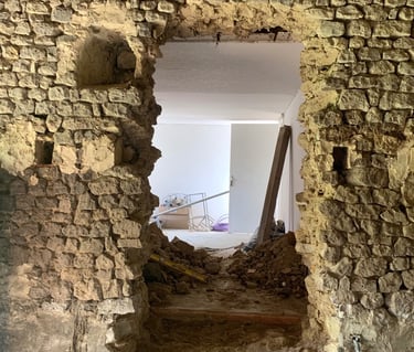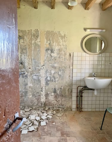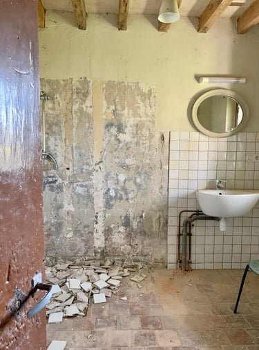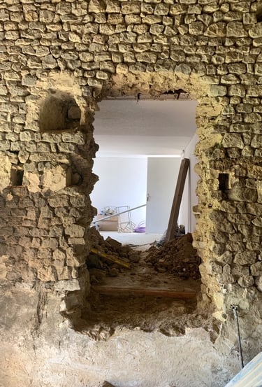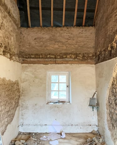 Réfection des toits, terrassement du jardin, piquetage de tous les murs, enduits, création d'ouvertures, de drains, réfection des sols, de l'électricité, de la plomberie, changement de fosse septique, maçonnerie, jardinage, carrelage, pose d'IPN, peintures, incantations vaudous... Je crois qu'on a tout fait.